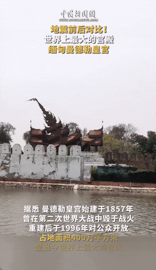 曼德勒皇宮,這座象徵緬甸貢榜王朝輝煌的19世紀木質宮殿,在地震中宮牆與塔樓倒塌,護城河城牆部分坍塌,倒映水面的詩意畫面從此殘缺。