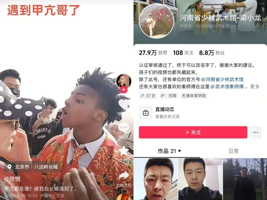 在河南行的直播中,甲亢哥為學中國功夫換上光頭皮膚,卻因誤入山“小雷音寺”,耗時2小時找不到少林寺當場崩潰流淚,最終在文旅局協助下拜師少林梁師傅。