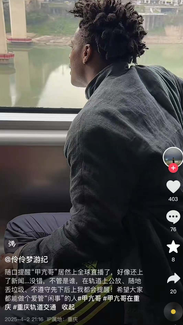 隨後,“甲亢哥”點頭表示贊同,稱感謝提醒,並用中文回覆“謝謝”。當晚這位女生在自己賬號發了視頻,説提醒不文明行為是每個人的責任,希望多傳遞正能量,也獲得了全球網友的好評。