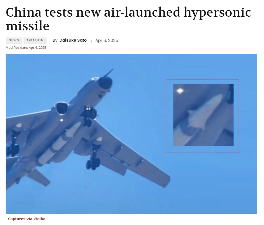 繼“海峽雷霆-2025A”聯合軍事演習中,中國空軍列裝的、由轟-6K型中型轟炸機攜帶的某型空射彈道導彈/高超音速飛行器正式亮相後。
