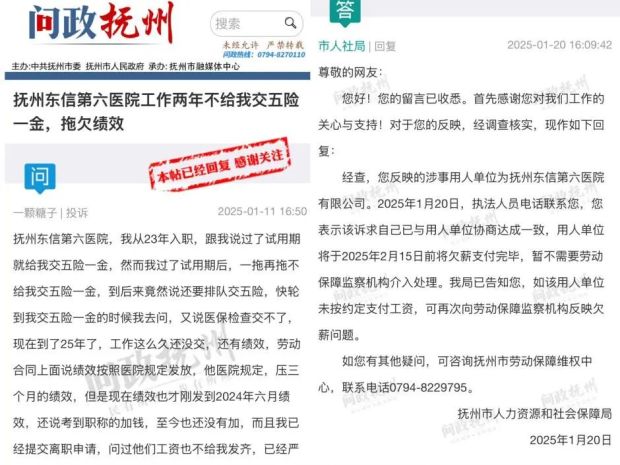 今年1月,該院職工在“問政撫州”平台留言