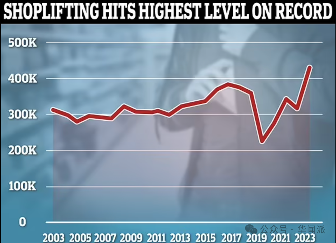 根據英國零售協會(British Retail Consortium)的數據,2023年英國每天發生超過2000起針對零售員工的暴力或辱罵事件,比2020年增加了三倍。與此同時,警方破案率卻大幅下降——在截至2023年12月的一年裏,有245,500起商店盜竊案因無法確認嫌疑人而不了了之,平均每天672起。