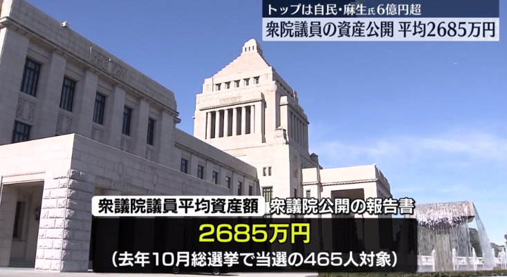 去年共選舉465名議員,根據眾議院公開的報告書,平均每個議員的資產額為2685萬日元(摺合人民幣約135萬元)。
