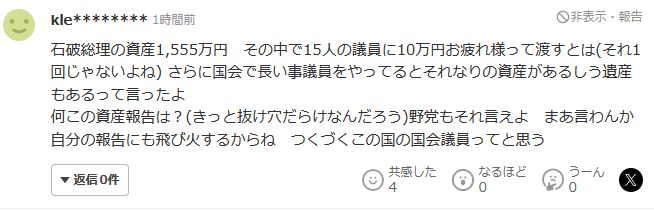 石破總理的資產1555萬日元,但給15名議員10萬日元辛苦費(不是一次吧),而且在國會做了很長時間的議員,也有相應的資產和遺產……