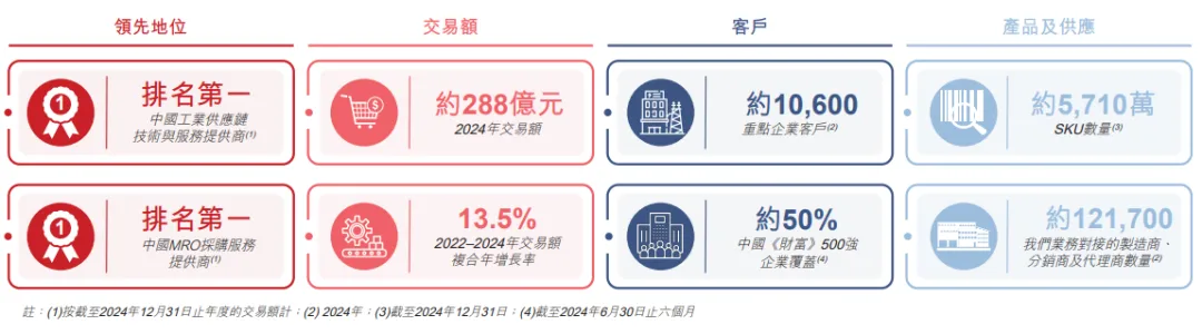根據灼識諮詢的數據顯示,截至2024年12月31日,按SKU數量計,公司在中國提供最廣泛的工業品供應。截至2024年12月31日,公司已提供約5710萬個SKU,涵蓋77個產品類別。於2024年,公司的商品供應源自於由約121700家制造商、分銷商及代理商組成的廣泛的且覆蓋全國的工業品供應網絡。