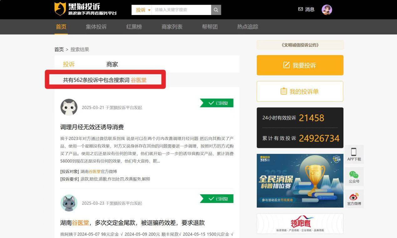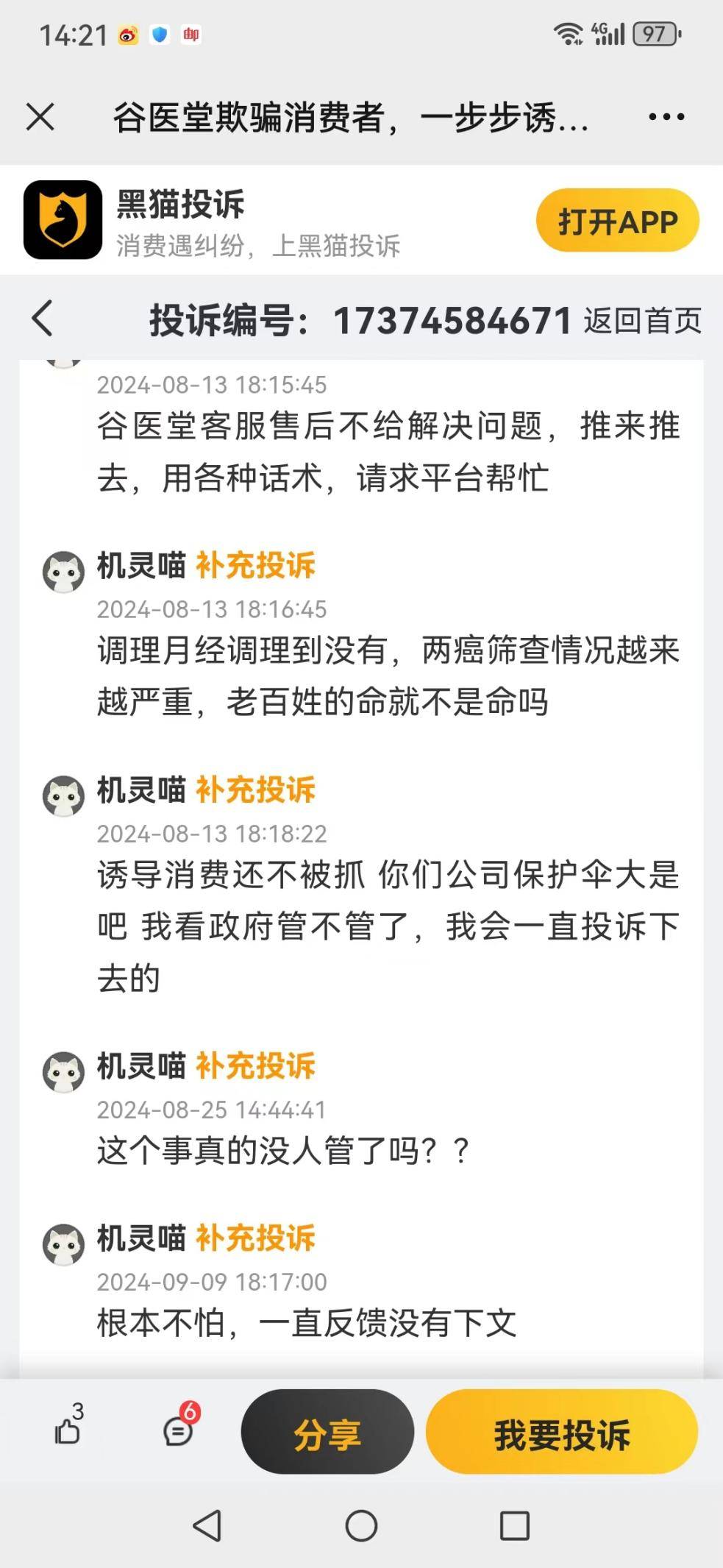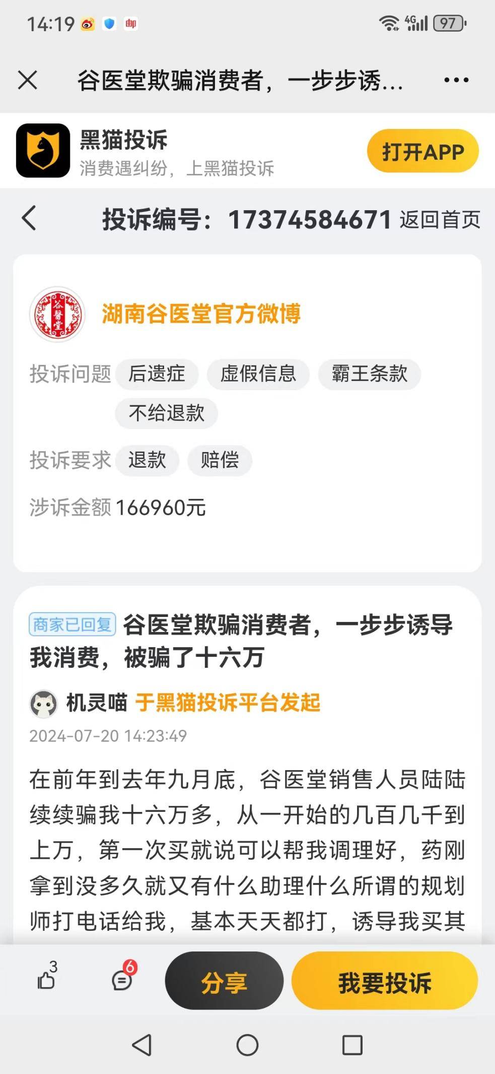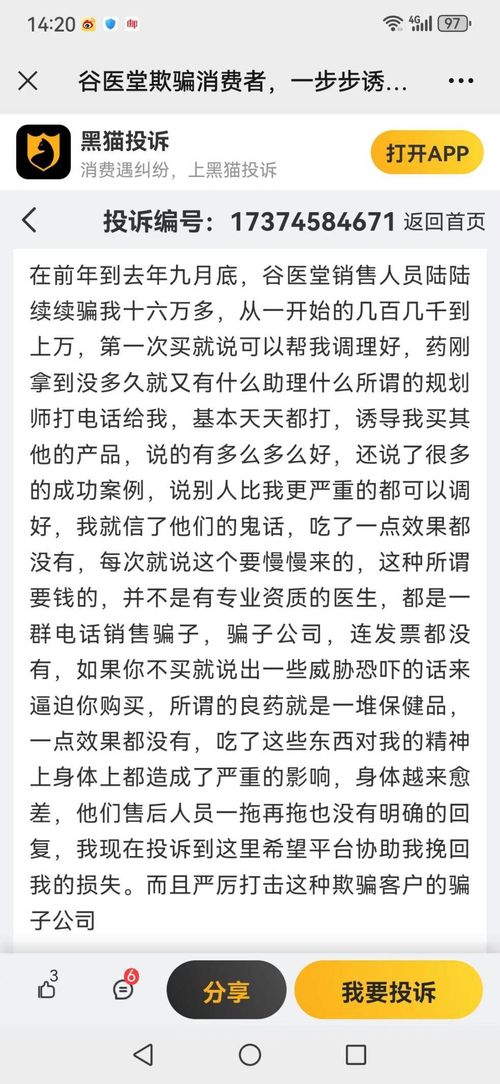 以投訴編號17374584671為例,署名“機靈喵”的消費者於2024年7月20日在黑貓投訴平台發起投訴,控訴谷醫堂在近兩年多的時間裏,誘導其多次購買能調理身體的藥品,導致其損失166960元。該消費者表示,谷醫堂銷售人員從一開始的幾百幾千到上萬,陸續誘導其購買產品,聲稱可以調理好身體,還列舉了很多的成功案例,稱別人比其更嚴重的都可以調好。然而,消費者購買並服用後,一點效果都沒有。這些銷售人員並非有專業資質的醫生,而是一羣電話銷售,甚至在消費者不購買產品時,還會使用威脅恐嚇的話語逼迫消費者購買。售後人員也是一拖再拖,沒有明確的回覆,給消費者的身體和精神都帶來了嚴重影響。