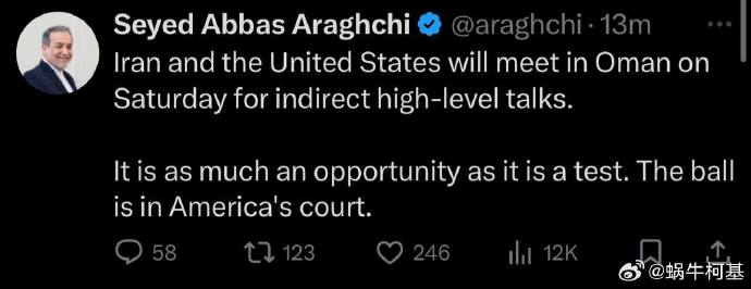 “伊朗和美國將於週六在阿曼舉行高層間接會談。這既是機遇,也是挑戰。球在美國手裏。”