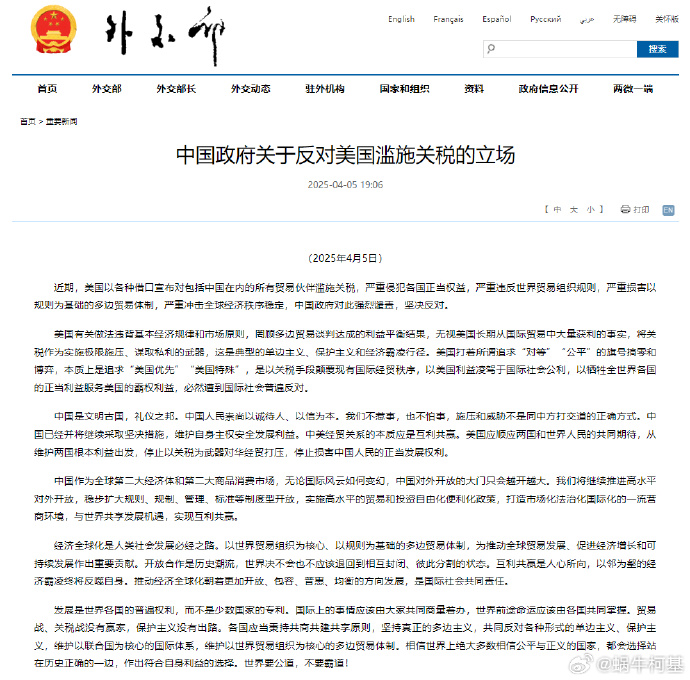 “美方對華加徵所謂“對等關税”毫無根據,是典型的單邊霸凌做法,中方已經採取的反制措施是為了維護自身主權安全發展利益,維護正常的國際貿易秩序,完全是正當之舉。美方威脅升級對華關税,是錯上加錯,再次暴露了美方的訛詐本質,中方對此絕不接受。如果美方一意孤行,中方必將奉陪到底。”