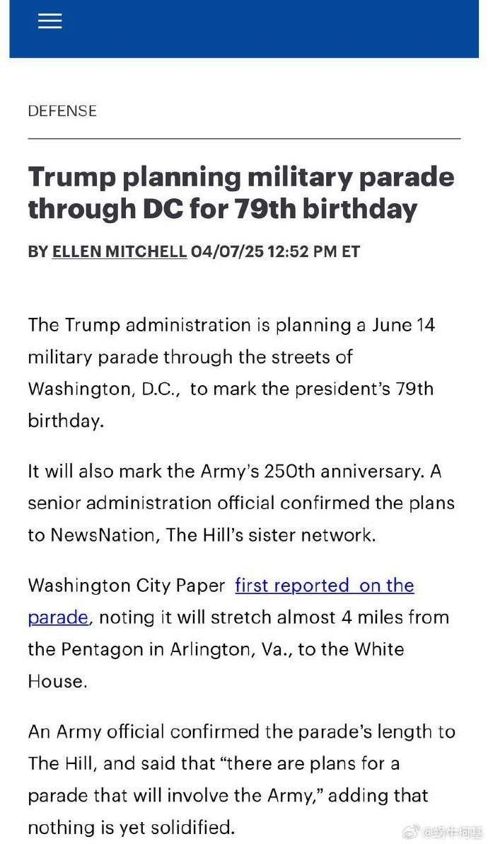 🇺🇸 特朗普政府計劃於 6 月 14 日在華盛頓舉行閲兵式,紀念美國陸軍成立 250 週年。巧合的是,特朗普當天正好 79 歲。