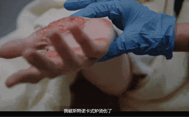 手被燒傷的單親媽媽,一邊痛得齜牙咧嘴,一邊催醫生啥時候能好。