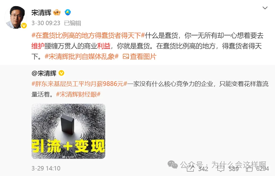 事實上,宋清輝批判的所謂胖東來靠流量活着,恰恰是宋清輝這種所謂經濟學家的日常而已,他是典型的賊喊做賊,我們且看看他微博中那顛三倒四語無倫次的內容。