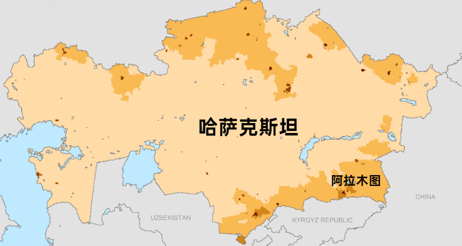 ▲哈薩克斯坦人口密度地圖,阿拉木圖為人口最多的城市