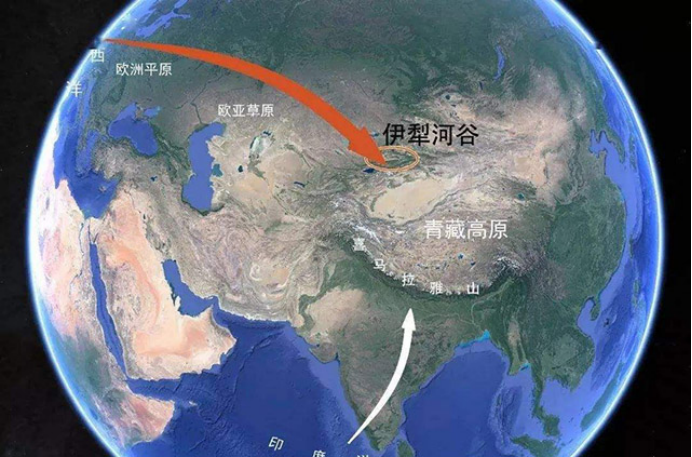 伊犁河谷不僅是絲綢之路的重要節點,聯結着西域和中亞,而且因為天山在此處呈“V”字型而擋住了大西洋水汽,造成充沛的降水,成為西域最主要的農墾區之一。