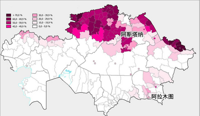 ▲俄羅斯人在哈薩克斯坦的分佈比例