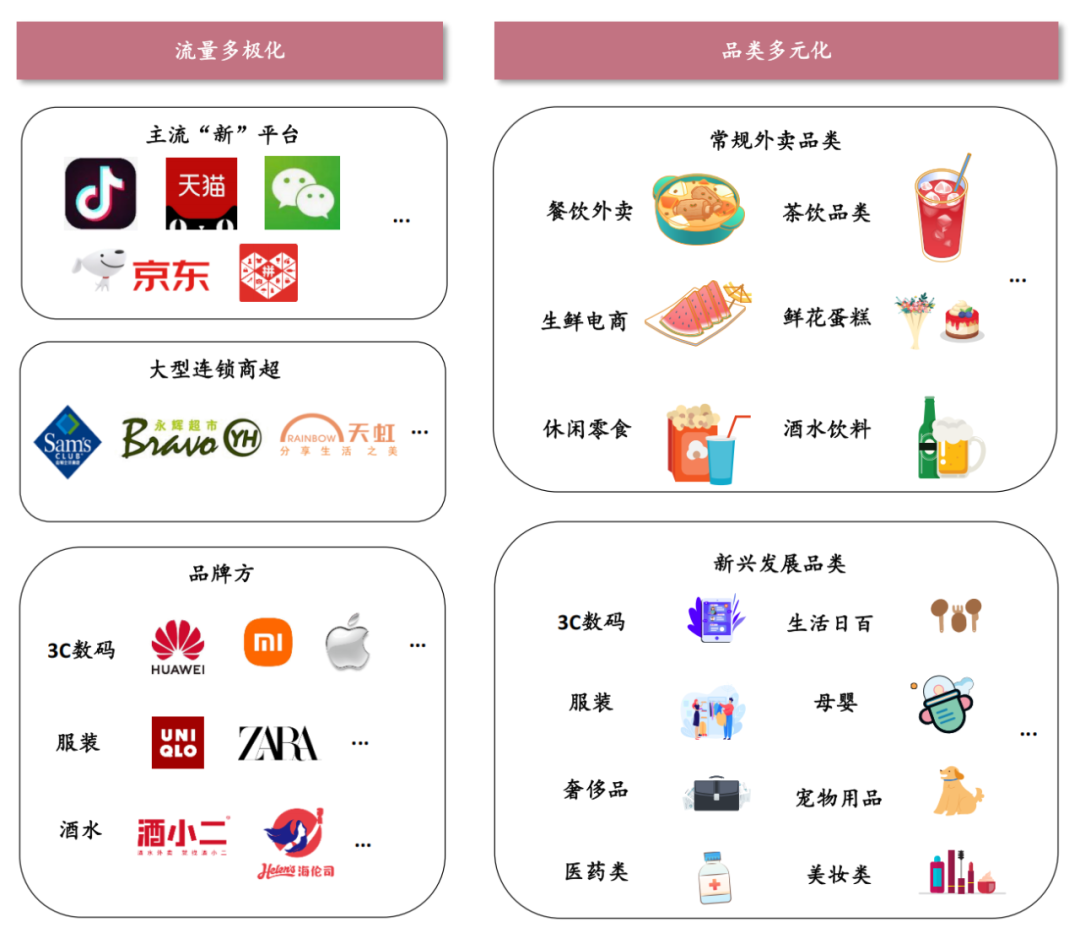 如何進一步拆分理解第三方+全場景業務結構的意義?沙利文在《2024年中國即時配送行業趨勢白皮書》中指出,中國即配行業當下存在品類拓展、業態創新、流量多極化等背景,從餐飲供給到全品類覆蓋再到下沉市場的數字零售增長,都給行業提供了新的增量。這就是我們分析順豐同城“賣水人”的切入口。