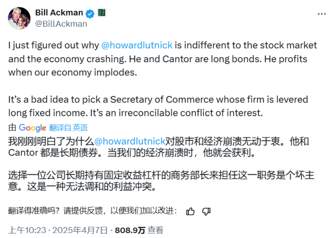 這也是為什麼對沖基金大佬比爾·阿克曼今早發推,猛烈抨擊美國商務部長霍華德·盧特尼克對股市和經濟崩潰無動於衷,因為霍華德·盧特尼克是做多債券的,他會從美國的衰退中受益,選擇他來擔任商務部長是個壞主意,他和這個職位之間有着不可調和的利益衝突。霍華德·盧特尼克是Cantor Fitzgerald這家美國債券交易巨頭的CEO,也是美國強硬關税政策的堅定擁護者。