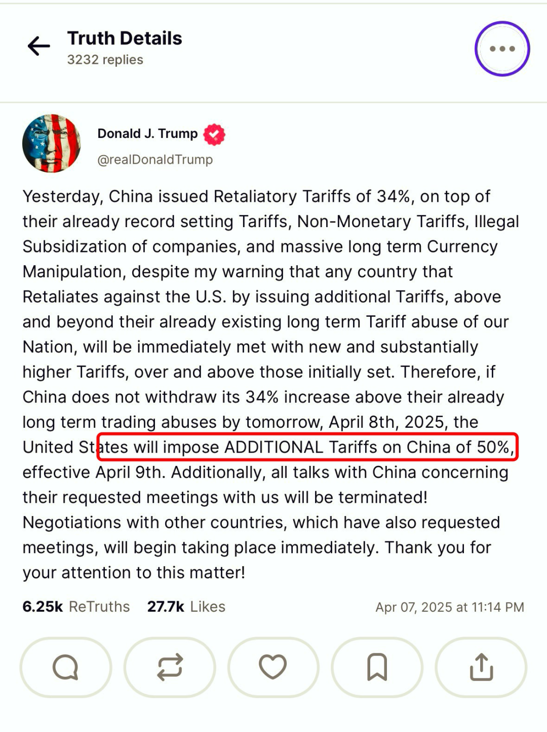 昨晚,川普發帖,威脅把關税增加到50%。