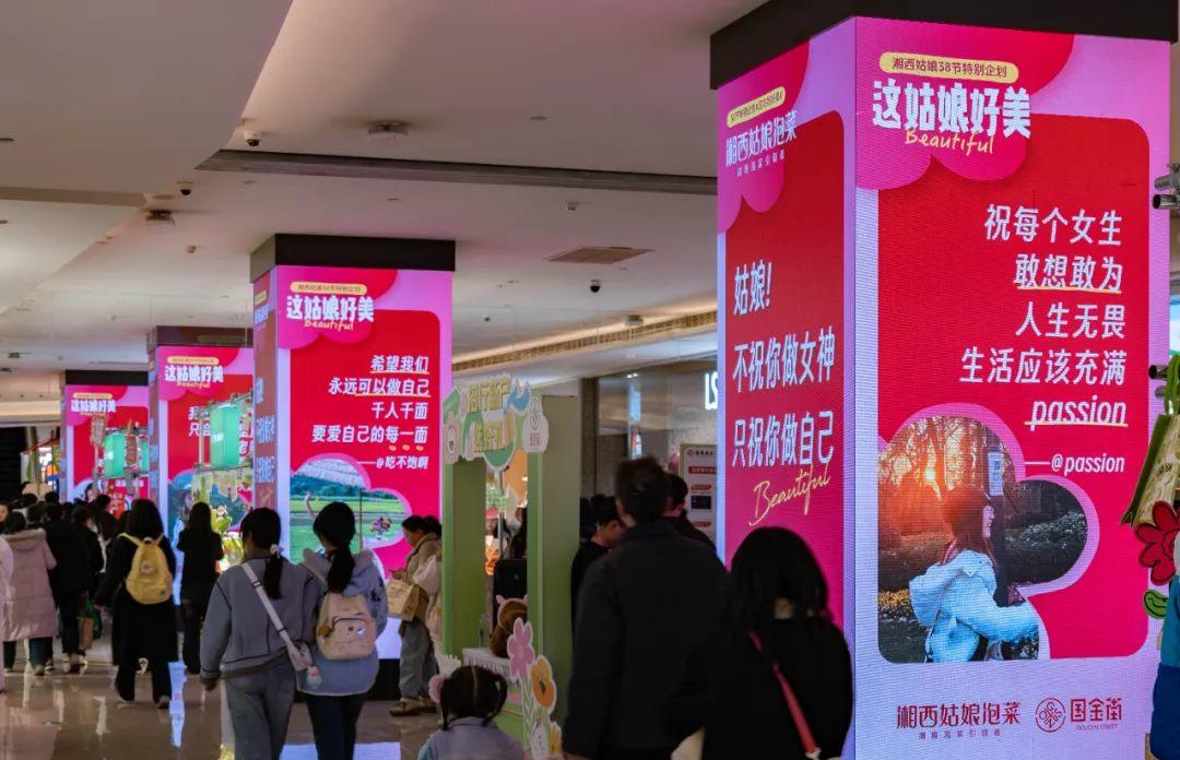 以IP為核心,湘西泡菜姑娘還通過打造周邊產品、注入在地文化等方式,強化消費者認知。今年婦女節期間,湘西姑娘泡菜徵集了一系列素人女性故事、祝福語等,在長沙國金街這一城市地標進行展示,不僅帶來千萬級別的曝光也拉近了與女性消費者的距離。
