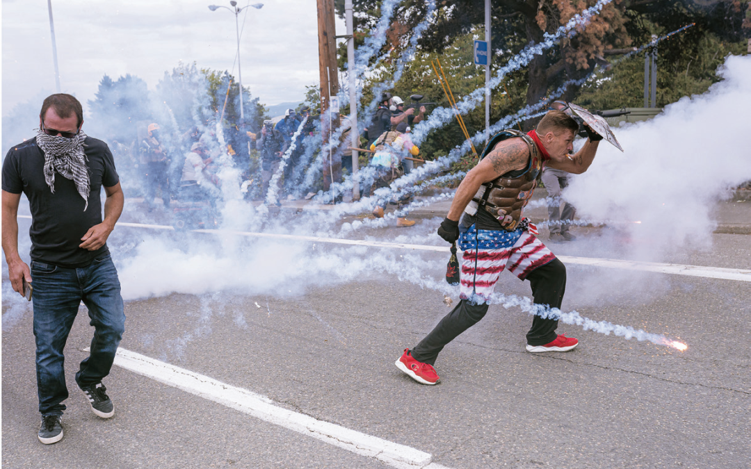 2021年8月22日,美國俄勒岡州波特蘭,美國極右翼團體同極左翼組織“反法西斯主義運動”(Antifa)以及其他左翼示威人士爆發衝突。圖為衝突場景 視覺中國/供圖