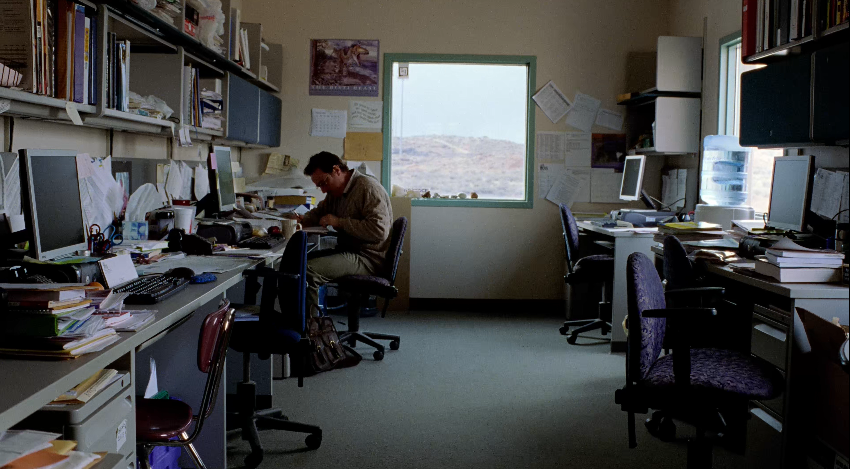 雜亂無人的教師辦公室,沃爾特獨自在角落吃午餐。