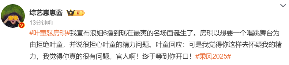坐擁2000多萬粉絲的房琪,和節目組一起偽造“聊天記錄”抹黑隊友,更是暗戳戳的説葉童精力不好不適合她的隊伍……