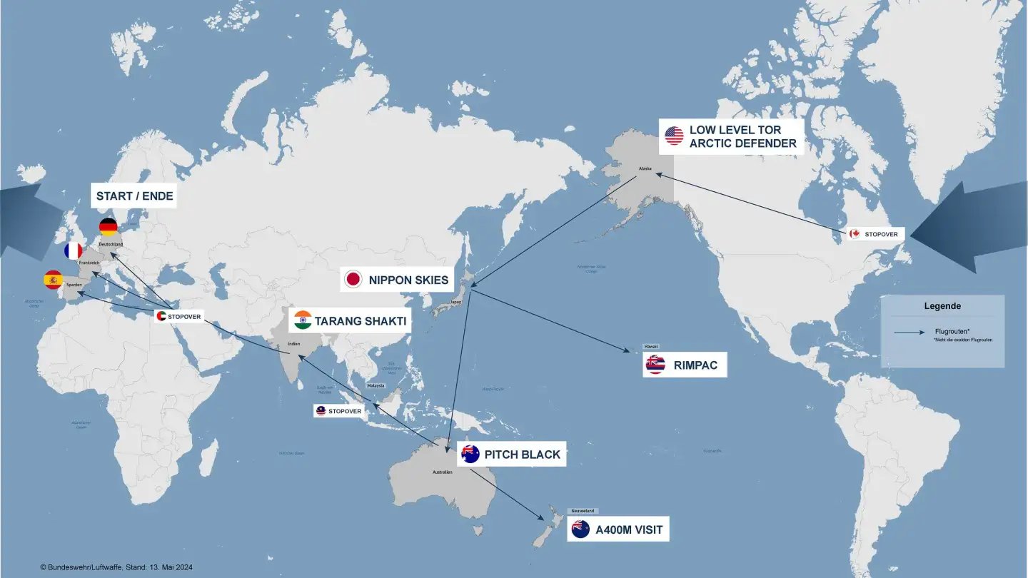 一張簡化的示意圖,展示了“太平洋天際-24”部署的主要飛行路線、目的地和聯合演習。德國聯邦國防軍/空軍