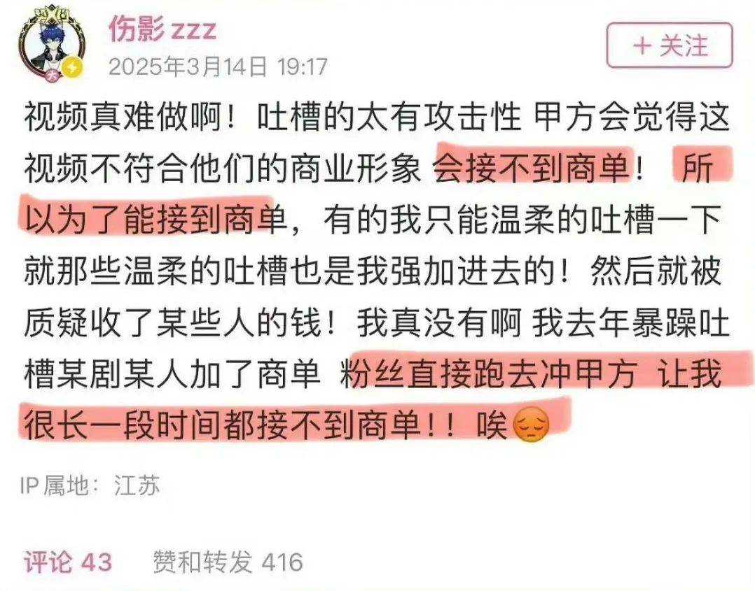 對於前者而言,當“為愛發電”的社區精神異化為“用數據發電”的生存法則,曾經多元的內容光譜,也不得不被馴化為流量黑市的單一貨幣。然而,當飯圈舉起鐮刀,UP主們反過來又因負面內容遭品牌拋棄,這幾乎成了一道無解的難題。
