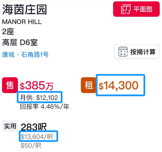 月供12102港幣,月租金14300港幣,租金是可以完全覆蓋月供的