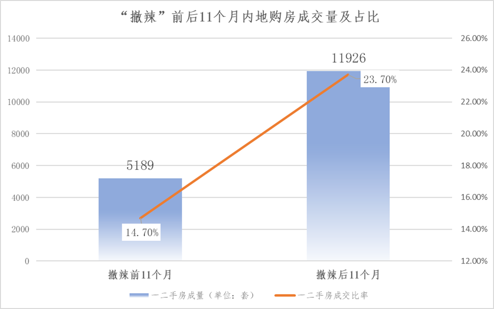 撤辣後11個月成交量是之前的兩倍還多,總成交佔比也有所提升