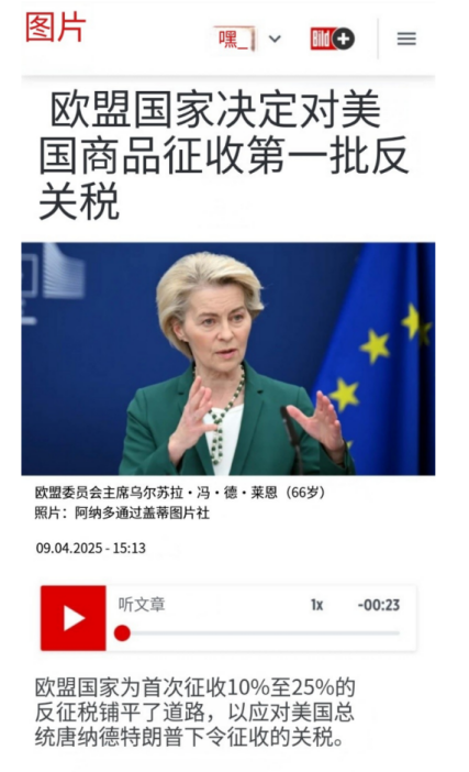 而在當地時間4月9日下午,歐盟27個成員國投票表決通過了對美國進口產品徵收25%關税的反制措施,以報復特朗普政府3月12日宣佈的對歐盟徵收鋼鐵和鋁的關税。對此美國財政部長貝森特表示美國可以將中國作為一個有盟友的集團來對待。此前特朗普表示“歐盟對我們太不好了。他們不接收我們的汽車……他們不接收我們的農產品……然而,他們一年卻送來數百萬輛汽車……事情不會這樣發展。”