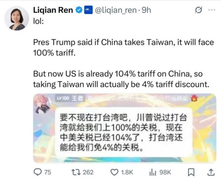 以至於有人開玩笑的説特朗普總統此前曾表示,如果中國大陸解放台灣,他將對大陸所有商品徵收100%的關税。現在美國已經對中國徵收了104%的關税,這意味着如果中國大陸解放台灣,將獲得4%的折扣。