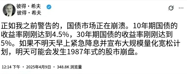 歐洲太平洋資本首席執行官兼首席經濟學家彼得·希夫表示正如我之前警告的,國債市場正在崩潰。10年期國債的收益率剛剛達到4.5%,30年期國債的收益率剛剛達到5%。如果不明天早上緊急降息並宣佈大規模量化寬鬆計劃,明天可能會發生1987年式的股市崩盤。