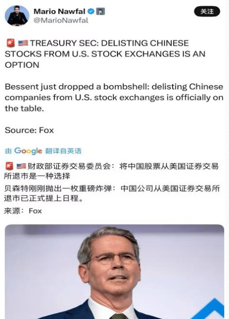 最新消息是美國財政部證券交易委員會表示將中國股票從美國證券交易所退市是一種選擇。貝森特剛剛拋出一枚重磅炸彈:中國公司從美國證券交易所退市已正式提上日程。來源是Fox新聞。