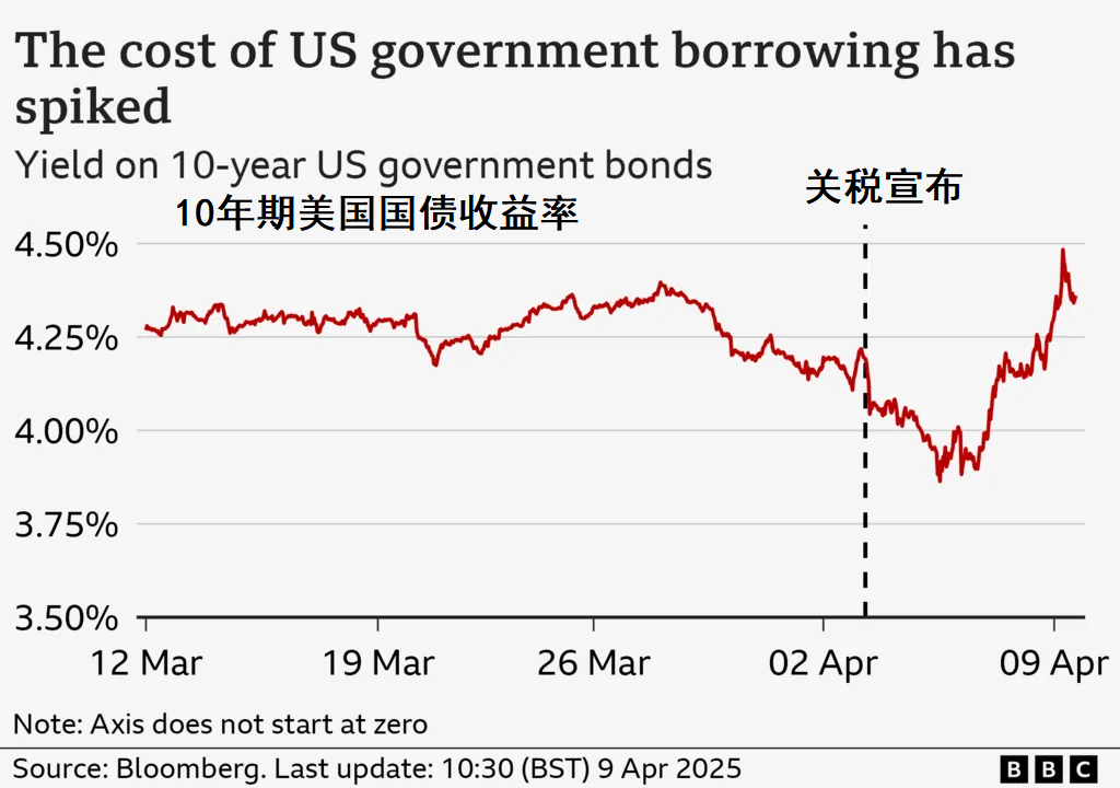 要知道美國欠了一屁股債,在今年年中的時候,就會有大批的美債需要新債換舊債,而美國現在政府最大的支出就是債務的利息支出,居然比美國的軍費還要高。這利息降不下來本來就是個大問題。這裏有一個金融學的常識,債券越不值錢,付的利息就越高。而這裏更嚴重的事情是,美債居然沒有人買了。一開始有人估計是美債排名第一的國家在拋售,後來説不是;然後有人懷疑是日本,日本的財長馬上出來説不是他們乾的,那麼很有可能就是許多被特朗普加徵關税的國家,都在拋售美債。