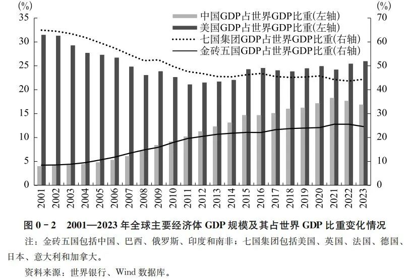 然而,美國經濟對全球增長的貢獻已顯著縮小,而美國經濟權重與美元主導地位的不對稱性卻顯著擴大。美國在世界GDP中所佔比重已從二戰結束後的45%下降至近年的25%左右,而中國佔世界GDP的比重已經達到17%左右(見下圖)。