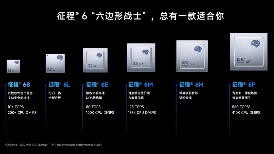 然而地平線絲毫沒有放緩腳步的意思,2024年4月,征程6的亮相出乎了所有人的預料,行業這份驚訝與驚喜並存的情緒,不止體現在迭代週期上,還在於征程6一改往日單點式產品策略——一口氣發佈了從征程6B到6P六款計算方案——完成了從產品到系列的身份躍遷。