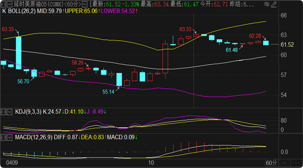 原油即時行情分析:隨着原油的暴拉1小時圖形布林帶上軌上移到65.4為止,目前時間臨近歐盤出現向下拐頭跡象,我預計隨時時間推移1小時布林帶上軌還會下移至65.2下方,那麼思路還是以65.2下方看空對待。盤面上來看4小時布林帶三軌平行發展,上軌承壓63.9位置,早盤反彈的高點觸及63.3轉跌,而本週一反彈高點只是在63.8一線,既然高點下移就該順勢看空。