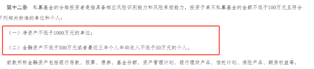 在《私募投資基金監督管理暫行辦法》裏規定,私募基金投資額不能低100萬,並對投資者有非常嚴格的要求。