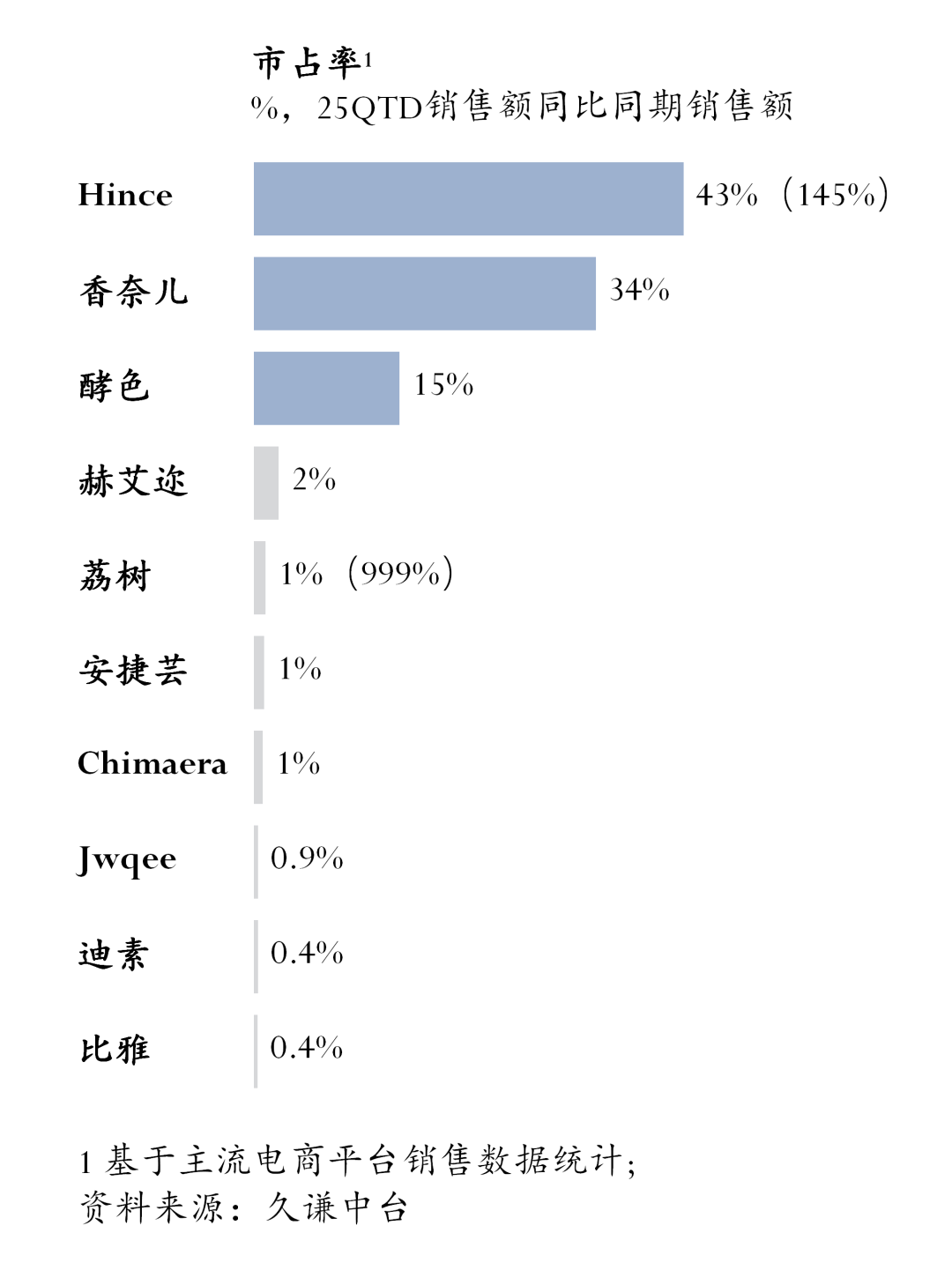 Hince以43%的市佔率位居榜首,銷售額同比增幅高達145%,顯示出強勁的市場擴張能力。香奈兒以34%的市佔率緊隨其後,憑藉品牌影響力穩居第二。酵色市佔率為15%,佔據一定市場份額。前三品牌合計市佔率達92%,市場集中度較高,頭部效應明顯。