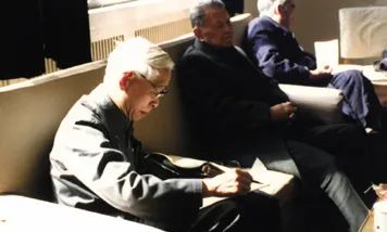 ▲馮德培(左)在生物學部會上查閲會議文件(圖片來源:中國科學院院士文庫)