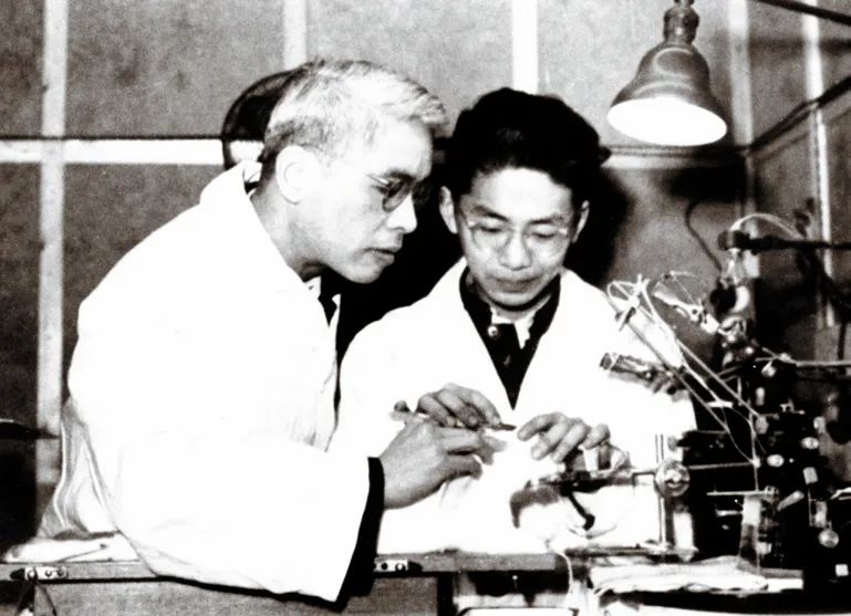 ▲馮德培(左)指導學生做家兔大腦解剖實驗(圖片來源:中國科學院院士文庫)