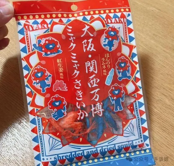 這紅與藍的包裝與笑嘻嘻的開朗脈脈可能讓你無法理解到底是啥,只能感受到些許異域瘋情,而打開的紅與藍交織的細長物品又讓人説不清道不明,嗯,這是魷魚絲……