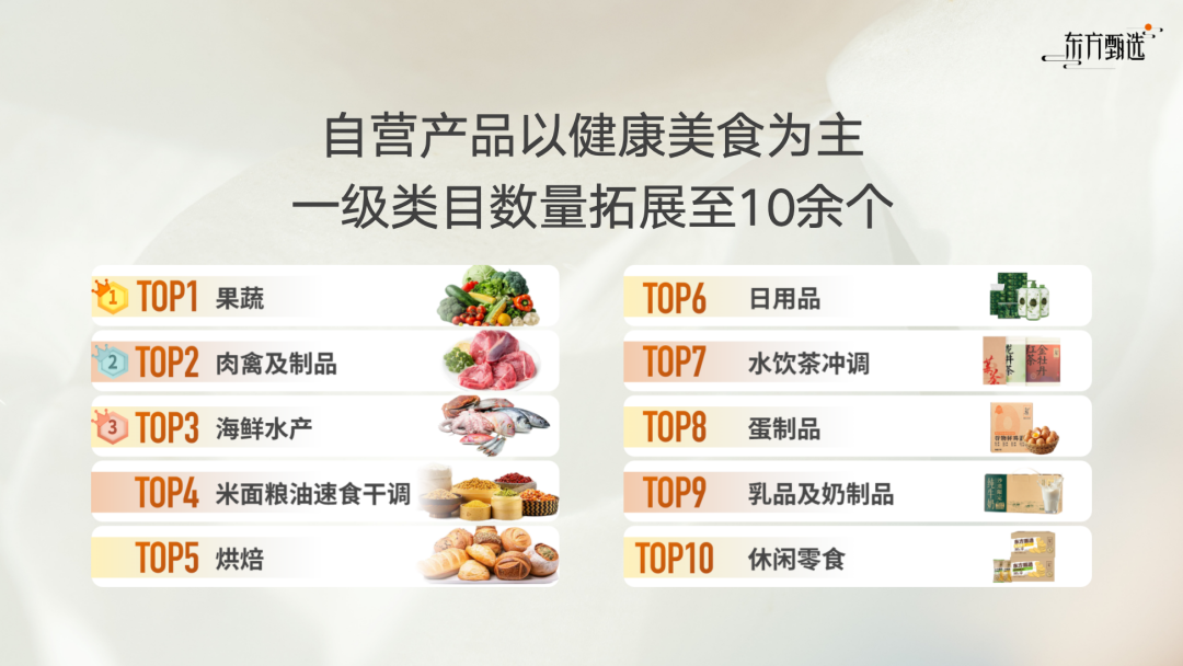 東方甄選從一開始直播帶貨時,就選擇了自營產品的路線,並且專注農副產品和食品,在供應鏈和產品品類上有着強大的優勢。東方甄選官方微信公眾號顯示,目前東方甄選自營產品的一級類目數量已拓展至10餘個,自營產品銷量在總銷量佔比中達46%,APP內商品總量拓展至7000餘款,能滿足用户一站式購物的需求。