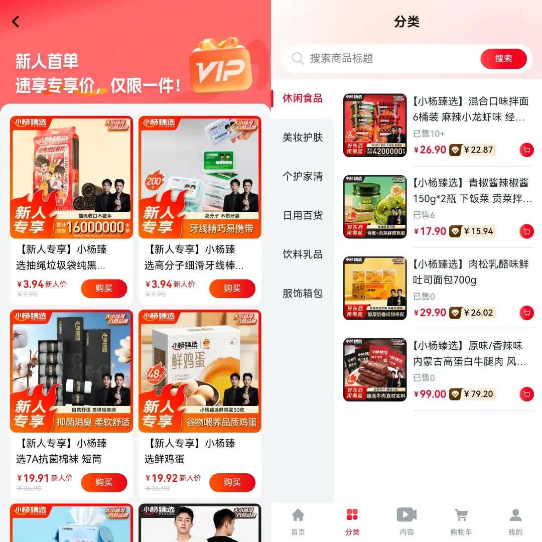 除卻各類自營商品外,APP首頁最為顯眼的就是新人首單福利,鮮雞蛋、抽繩垃圾袋和棉襪等商品,售價低至3.94元,最高的售價也不過19.92元,這些都是小楊臻選曾經的爆款單品,部分單品全網銷量已超1600萬件,低價和日用品的高頻消費屬性,足夠吸引新用户下單。
