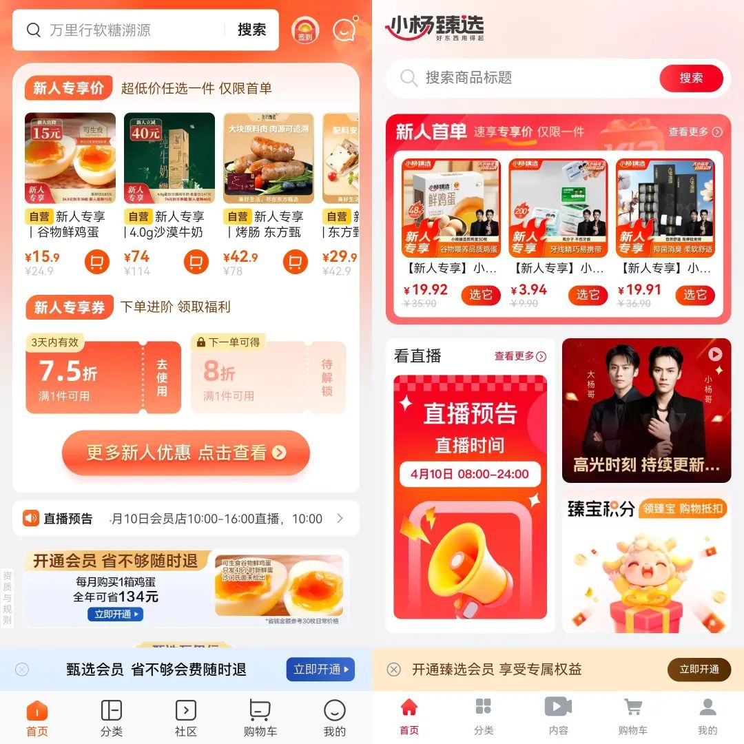 縱觀小楊臻選APP和東方甄選APP,兩者的佈局也非常類似,不僅售賣着自營商品,同樣在APP內上線直播、短視頻內容,還都推出了付費會員制度。