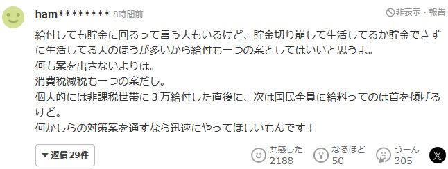 雖然也有人説即使發錢也會轉到儲蓄上,但很多人都是靠存錢或不能存錢生活的,所以發錢也可以作為一種方案。與其拿不出任何方案。