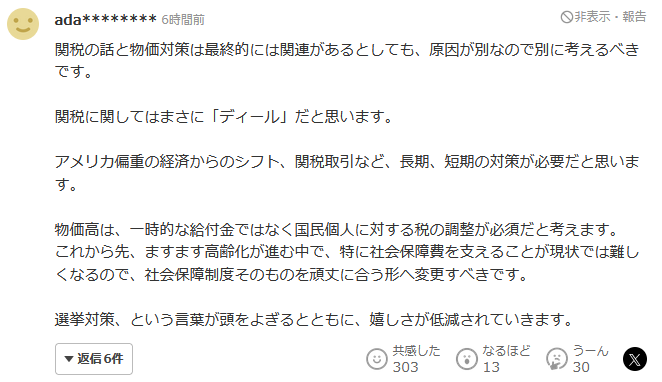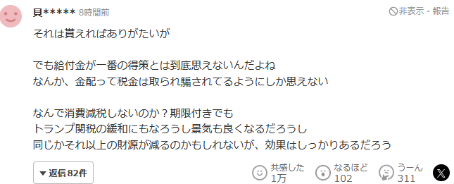 個人認為,在向非課税家庭發3萬日元后,接下來給所有國民發錢,是令人費解的。