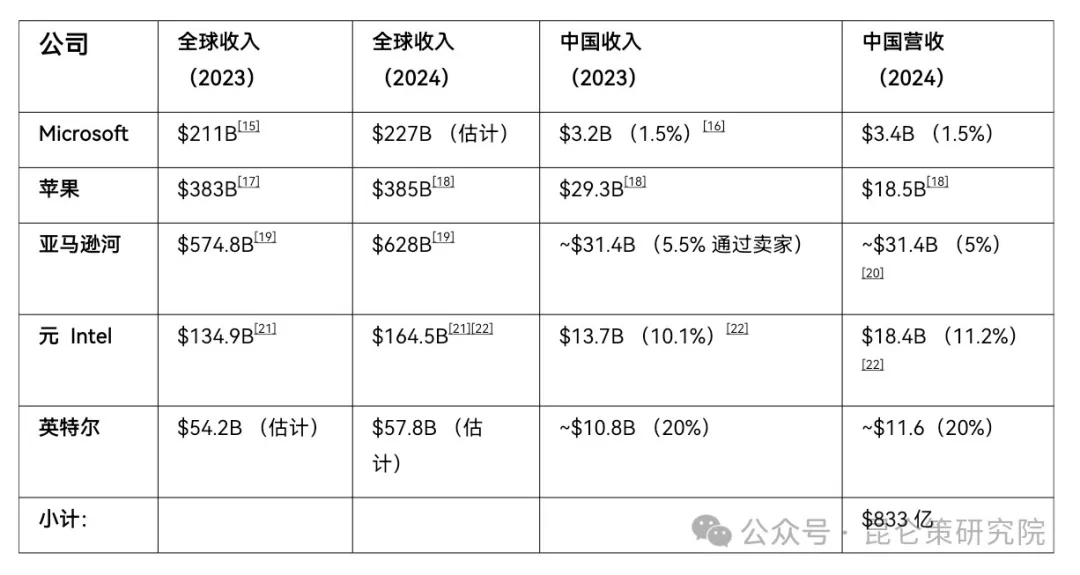 5)由於列出的50個美國公司基本都是跨國公司,有全球營收數字。但不知為何,大多數都沒有顯示其在華營收,因無明確的數據。基於行業標準的區域收入份額,中國區的營收通常為全球的5-10%。筆者這裏採取了最低端,即按5%的中國區域份額值估算。如按5%-10%的平均值7.5%估算,這50個美國公司的在華營收將遠高於這裏所提供的數據。