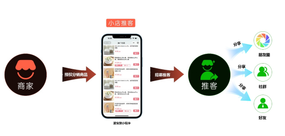 有一定粉絲流量基礎的微信小店帶貨者,如今可以在視頻號、公眾號、服務號等微信生態內進行全域帶貨;推客在接收到帶貨者信息後,則能在社羣、朋友等渠道進行商品推廣和銷售,讓渠道分銷實現更高效的增長。