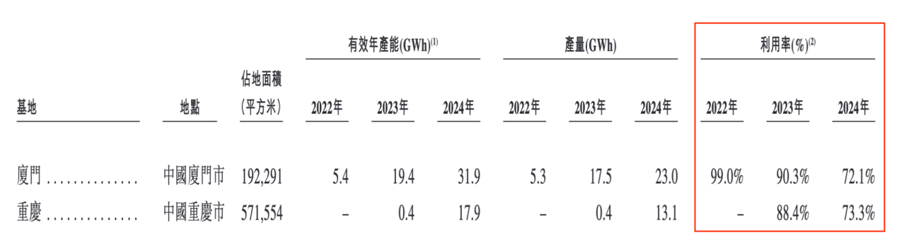 海辰儲能產能擴張,但它的產能利用率卻在不斷滑坡。廈門基地產能利用率從99%降至72.1%,重慶基地從88.4%降至73.3%。2026年計劃超100GWh,但2024年全球需求僅480GWh,行業產能過剩率40%。